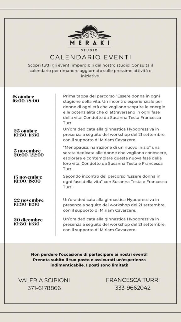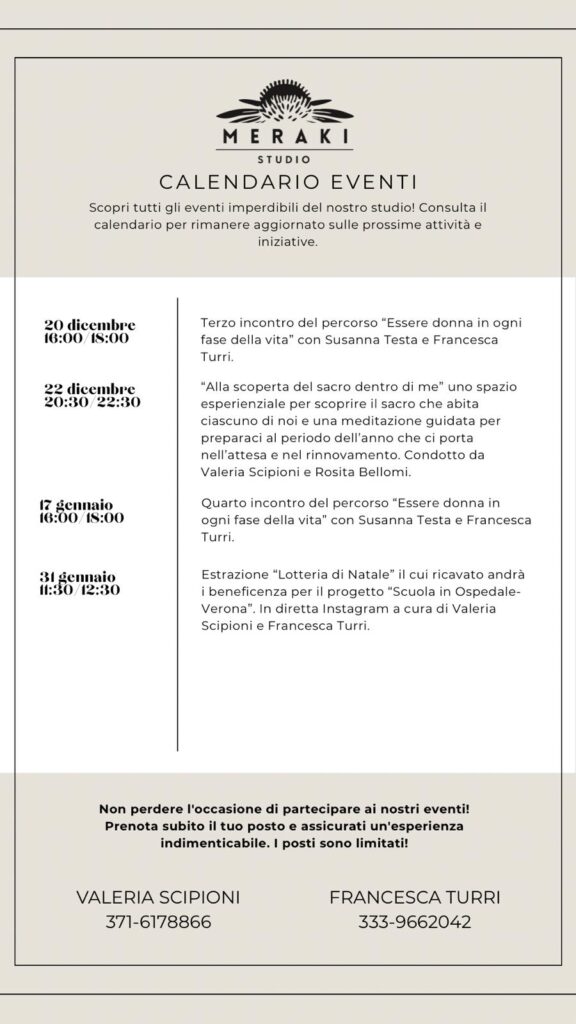 Il calendario dello studio è sempre ricco di appuntamenti dedicati a diverse esigenze: dalla crescita personale alle esperienze olistiche, dai laboratori esperienziali agli incontri formativi.